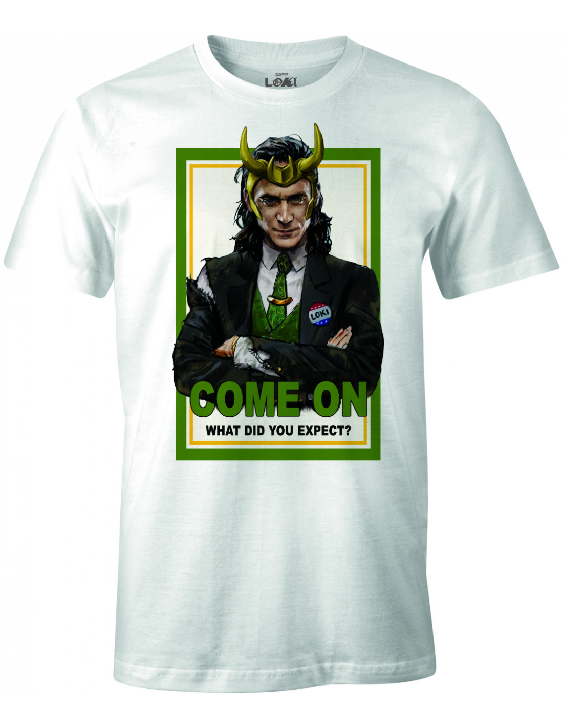 Oficiálně licencované pánské tričko bůh Loki s helmou. Triko je bílé barvy s krátkým rukávem.
