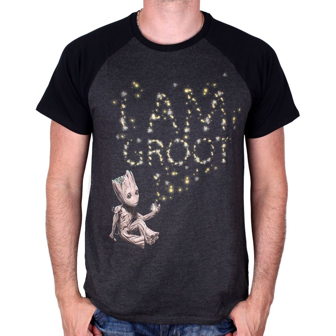 Černé pánské tričko s krátkým rukávem. Na přední straně je potisk roztomilé postavičky Groota ze série Strážci Galaxie (Guardians of the Galaxy) a nápis I am Groot.