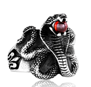Nerez ocelový prstýnek s kobrou, co má v puse červenou kuličku. Prsten had - kobra je vhodný pro muže i ženy.