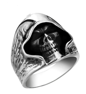 Nerez ocelový prsten lebka s kápí. Prstýnek s lebkou je stříbrné barvy a je vhodný pro všechny rockery, motorkáře a jiné drsňáky.