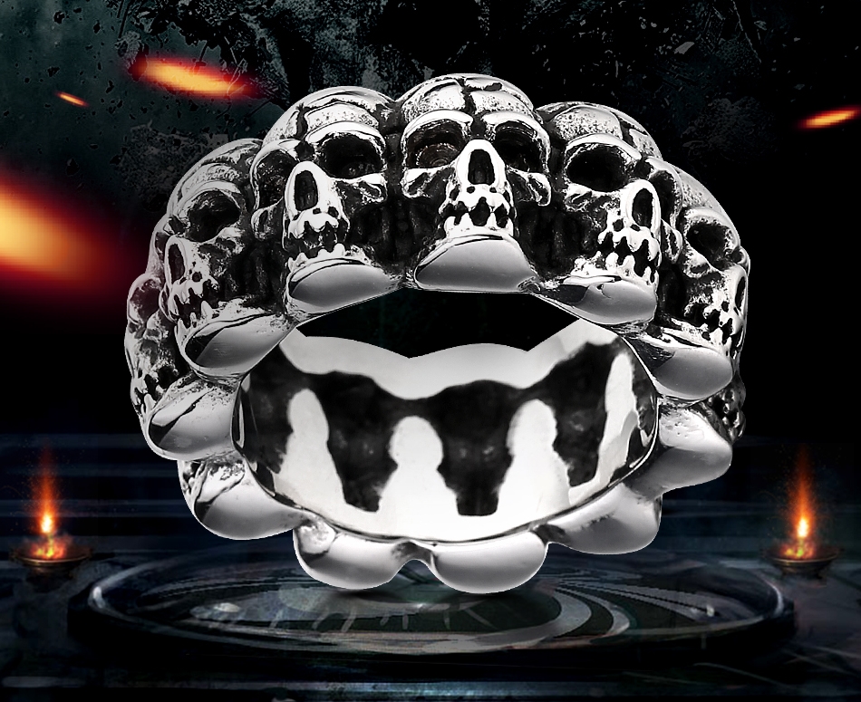 Drsný ocelový prsten s lebkami, které se táhnou po celém obvodu prstenu. Prstýnek lebky je vhodný pro všechny motorkáře, metalisty, rockery a jiné výrazné osobnosti. Mohou ho nosit jak muži, tak ženy.