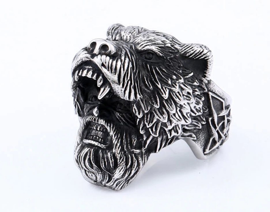 Ocelový prsten s hlavou vikinga a medvěda. Tento vikingský prstýnek medvěd je stylový doplněk pro tvou ruku. Je vyroben z kvalitní oceli, takže s ním můžeš jít i do vody!