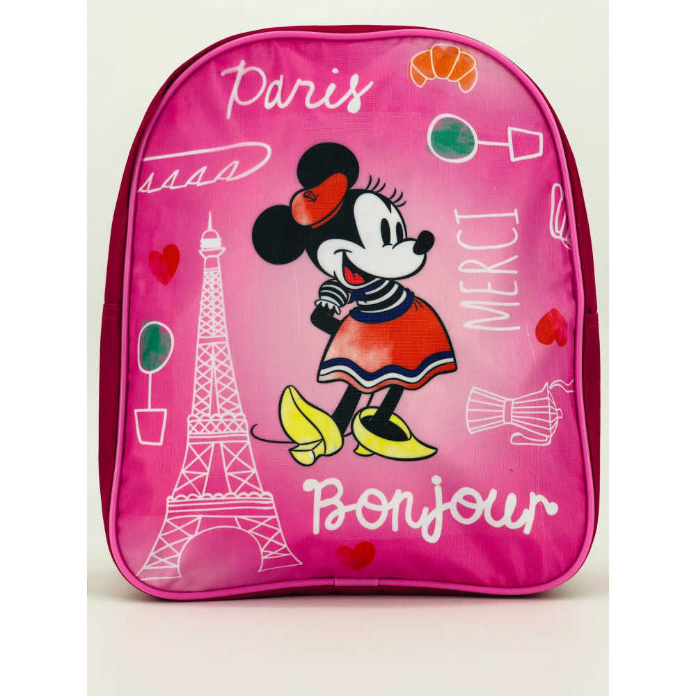 Růžový dětský batůžek s postavičkou myškou Minnie Mouse a francouzským nádechem. Na batůžku je Eiffelova věž a nápisy jako Paris, Merci a Bonjour. Batoh je růžové barvy.
