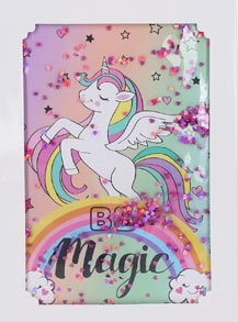 Stylový zápisník s jednorožcem. Blok jednorožec je velikosti A5, má tvrdé desky a jsou v něm zlaté flitry ve tvaru srdíček, které se pohybují v tekutině. Na notesu je jednorožec s barevnou hřívou, pod ní je duha a nápis Be Magic.