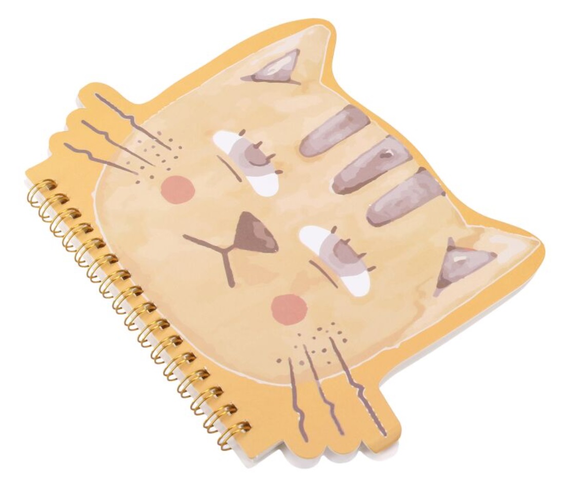 Stylový zápisník s kočkou. Blok kočka je velikosti 16 x 17 cm, je oranžové barvy a je na něm kreslená hlava kočky.