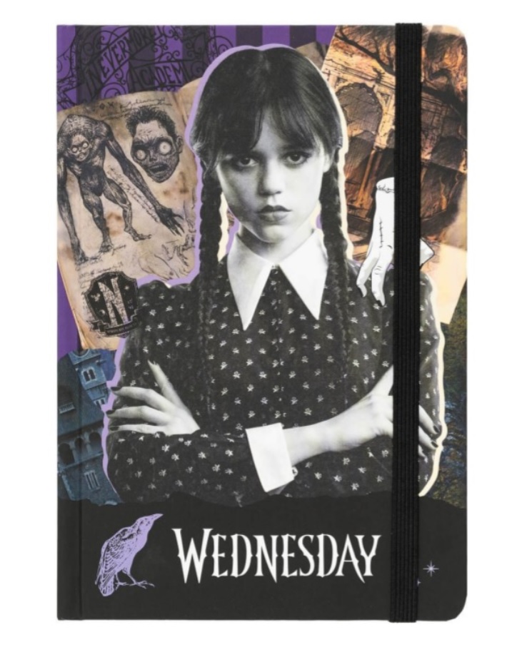 Licencovaný blok Wednesday Addamsová. Zápisník Wednesday má tvrdé desky a má tečkované stránky. Na úvodní straně je černovlasá dívka Wednesday. Diář je velikosti A5 a má 90 listů, tedy 180 stran. Blok je oficiálně licencovaný a má elastický pásek pro uzavření.