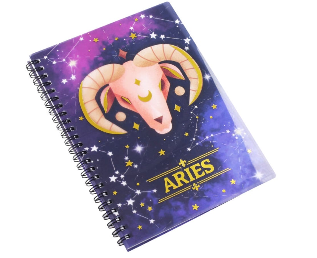Stylový zápisník znamení zvěrokruhu - beran (aries). Na bloku je znamení berana a nápis. Vhodný dárek pro všechny lidi narozené ve znamení berana.