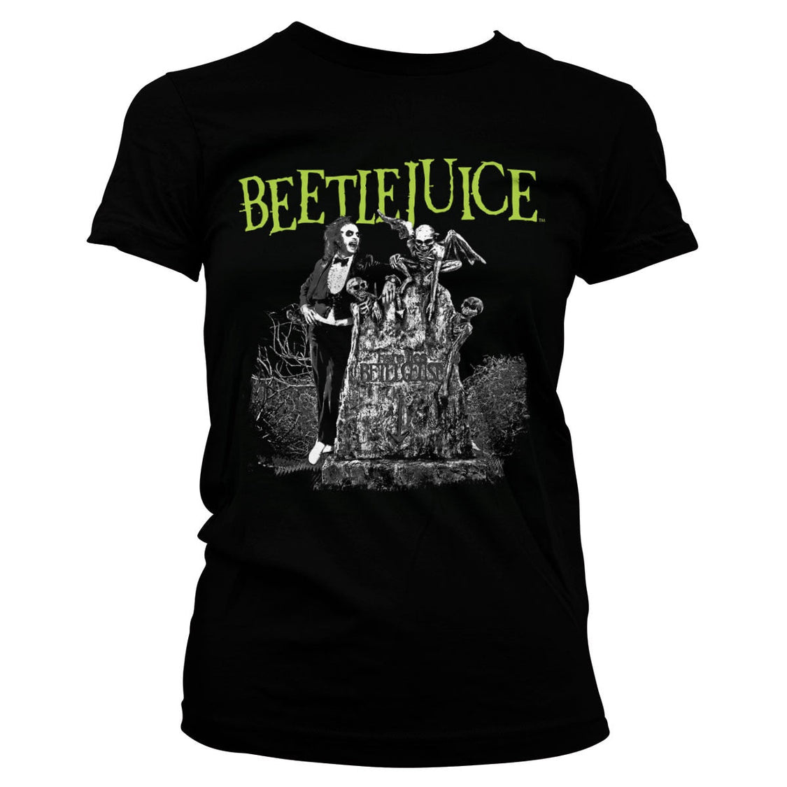 Dámské tričko s krátkým rukávem s motivem kultovního filmu Beetlejuice. Na tričku je šílený démon Beetlejuice a hrozivě vypadající náhrobní kámen. Obrázek je černobílý, nápis Beetlejuice je zelené barvy.