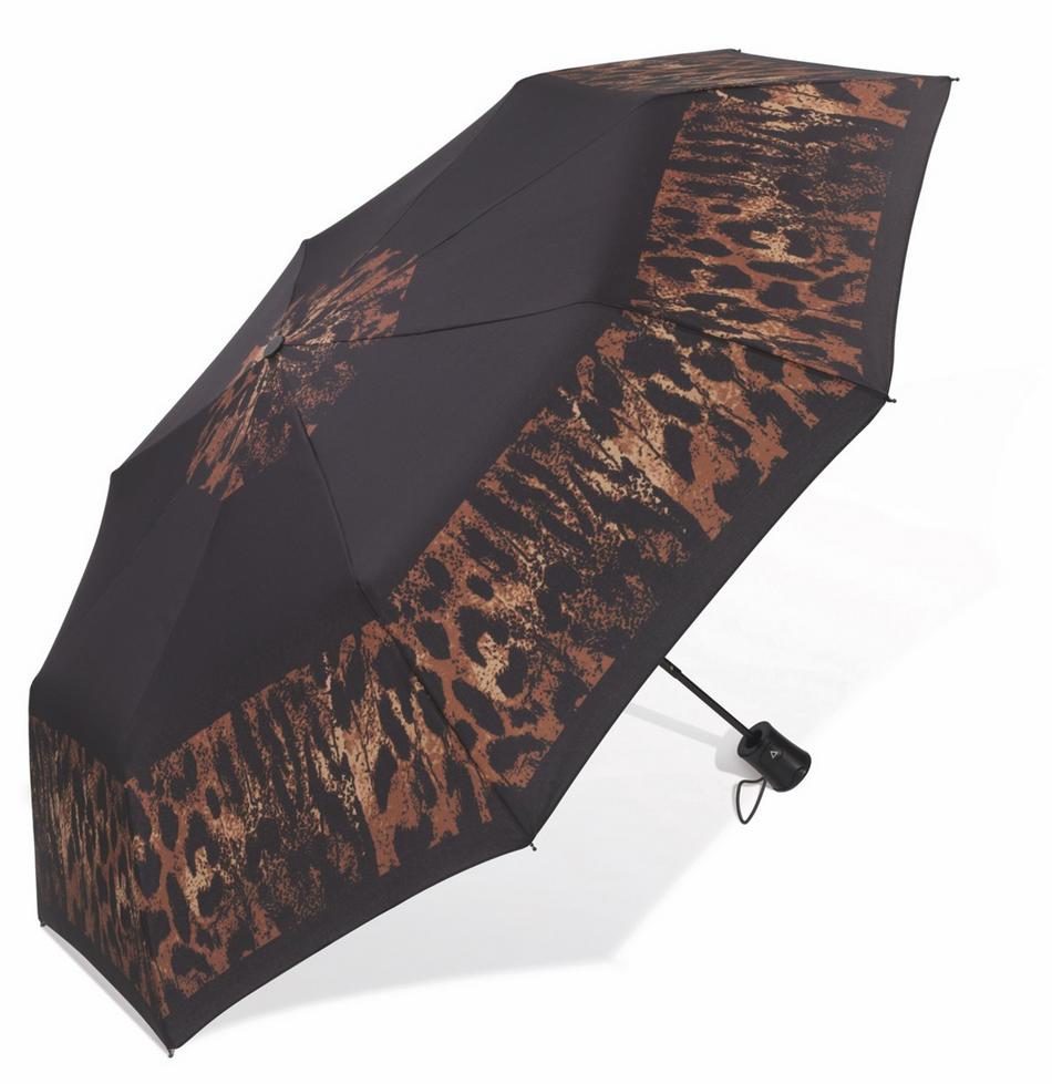 Černý dámský kvalitní automatický skládací deštník s leopardím vzorem. Deštník leopard působí luxusním dojmem. Tento deštník se zvířecím motivem ochrání člověka před deštěm či sluncem v každém ročním období.