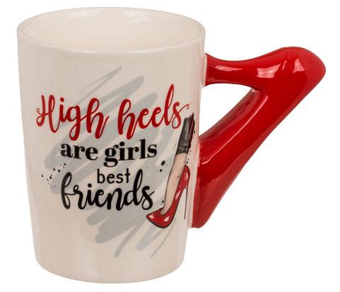 Originální hrnek červená dámská bota - lodička s vysokým podpatkem. Hrnek má ve tvaru dámské boty, na hrnku je obrázek dámské nohy s lodičkou a nápis High heels are girls best friends (lodičky jsou ženiny nejlepší kamarádky).