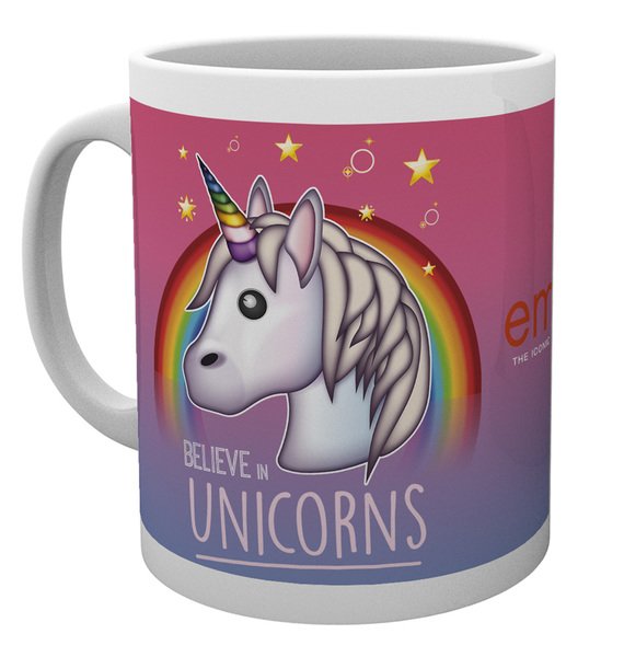 Barevný hrníček s jednorožcem, který má nádherně zbarvený roh. Na hrnku je nápis Believe in Unicorns. Je vhodný pro tvůj oblíbený nápoj, ať je to káva, čaj, či cokoliv jiného.