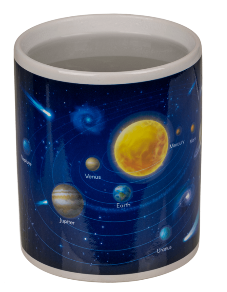 Originální magický hrnek sluneční soustava. Hrníček je bílé barvy. V normálním stavu na něm jdou vidět hvězdy a názvy planet, teprve po nalití horkého nápoje mění barvu/obrázek a odkryjí se jednotlivé planety a jiné obrazce.