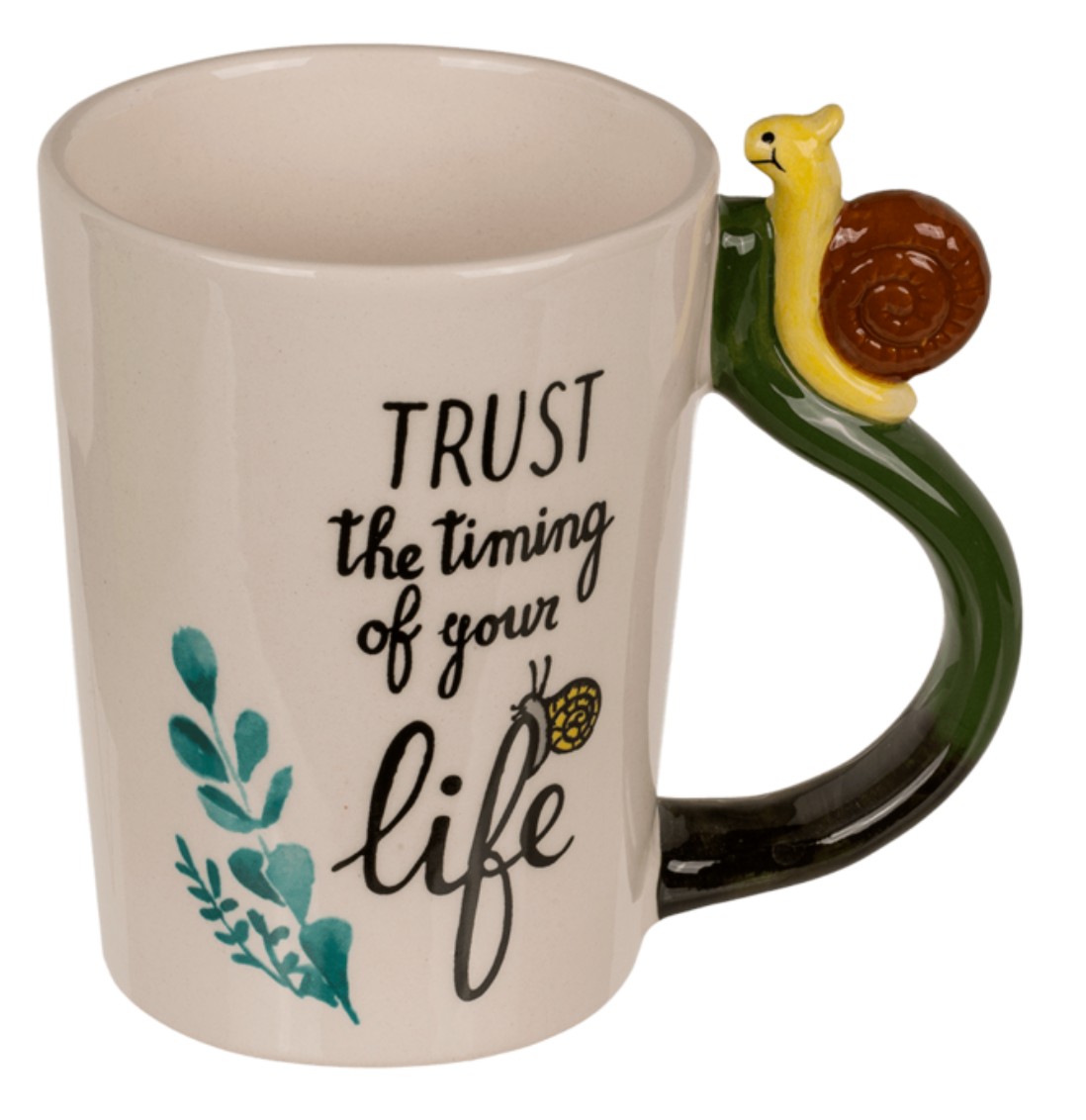 Originální hrnek se šnečkem. Hrníček šnek má ucho, po kterém leze malý šneček s ulitou. Na hrníčku je i nápis Trust the timing of your life.