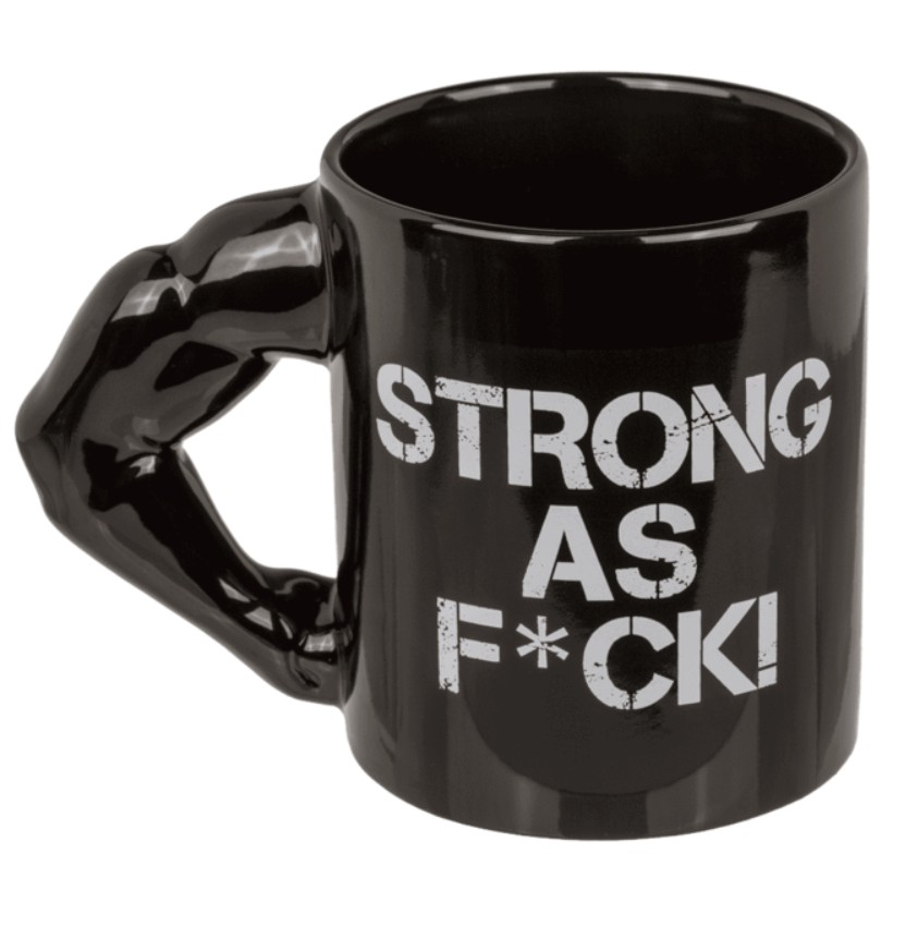 Černý drsný hrnekse svaly - silák svalovec kulturista a nápisem Strong as Fuck. Ucho hrnku je tvarované do hodně namakané pracky. Miluješ posilování, nebo jsi prostě jenom silný muž/žena? Hrnek je vhodný dárek pro všechny lidi, co milují fitko a posilování, nebo jsou jenom silní od přírody.