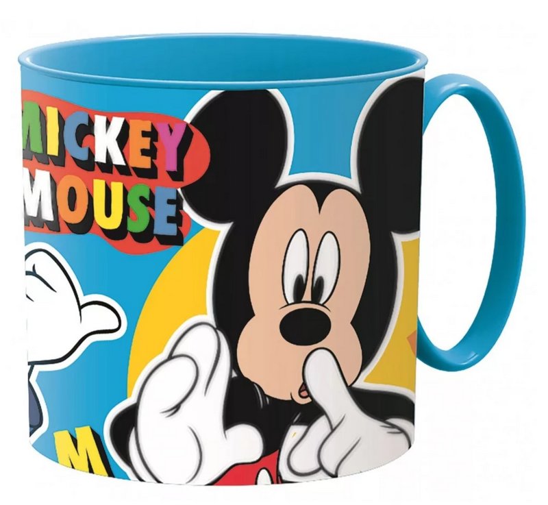 Stylový plastový dětský hrnek s myškou Mickey Mouse. Hrneček je světle modré barvy, je na něm barevný nápis Mickey Mouse a myška Mickey. Je vhodný na jakýkoliv oblíbený dětský nápoj.