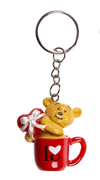Klíčenka - přívěsek na klíče - ve tvaru roztomilého hnědého medvídka, který v tlapičkách třímá srdíčko s mašličkou. Medvěd je v červeném hrníčku. Klíčenka medvěd je navíc balená v romantické dárkové mini taštičce, která poslouží jako skvělý dárek pro každého zamilovaného.