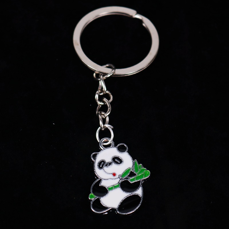 Kovová klíčenka ve tvaru medvídka pandy. Přívěsek na klíče panda, co třímá v tlapkách zelený stonek bambusu.