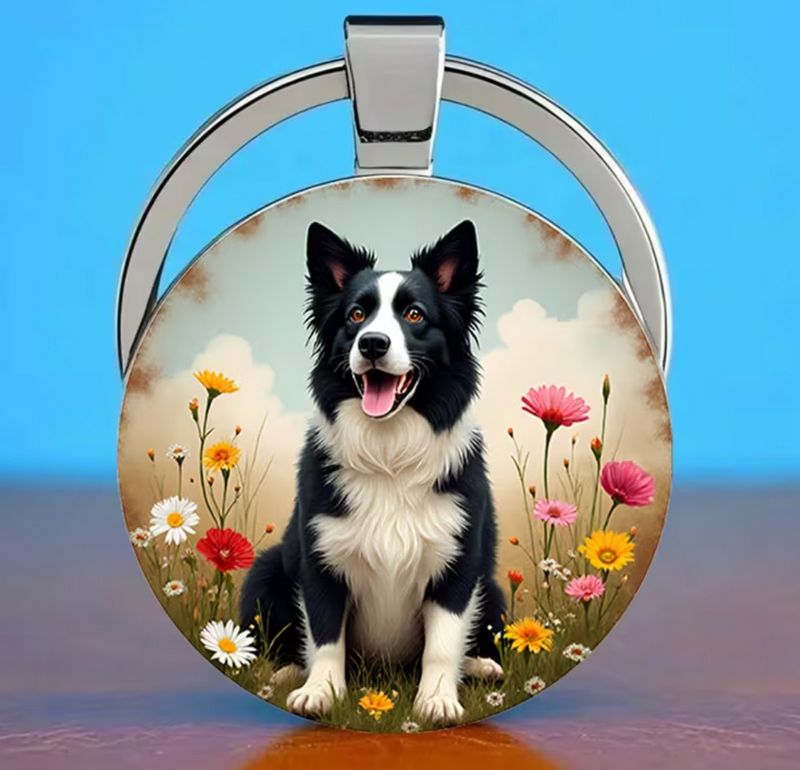 Krásný přívěsek na klíče se psem - border kolie. Na přívěsku je černobílá kreslená borderka, která jistě potěší každého majitele, nebo jenom milovníka tohoto plemene.