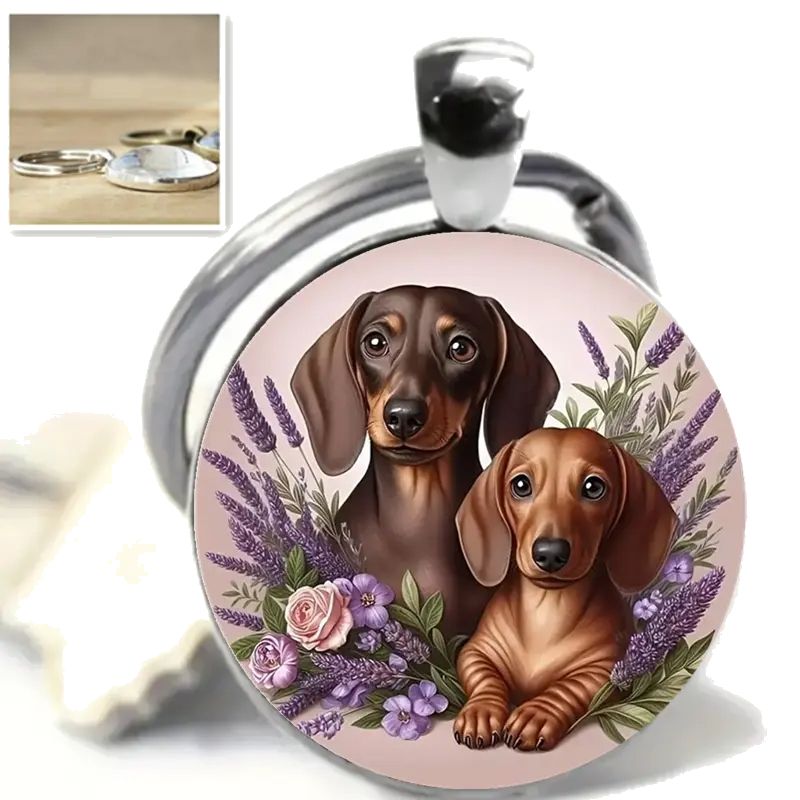 Stylový přívěsek na klíče se psem - jezevčíkem. Na přívěsku jsou dva roztomilí jezevčíci. Klíčenka s populárním plemenem jezevčík je vhodná pro všechny milovníky psů.