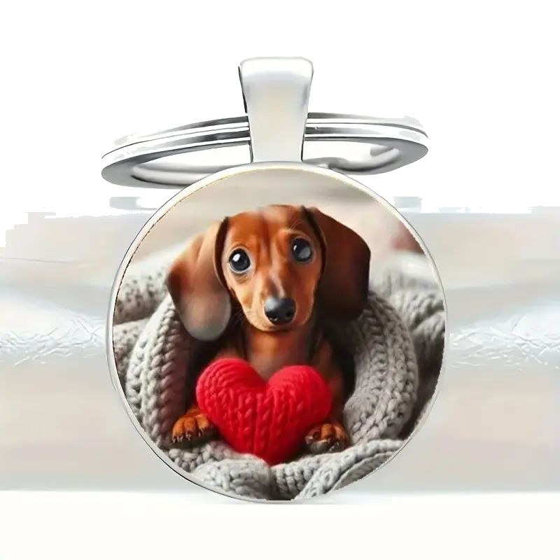 Stylový přívěsek na klíče se psem - jezevčíkem. Na přívěsku je roztomilý jezevčík se srdíčkem. Klíčenka s populárním plemenem jezevčík je vhodná pro všechny milovníky psů.