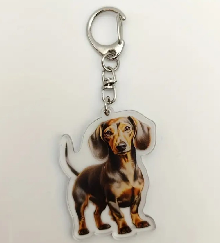 Stylový přívěsek na klíče se psem - jezevčíkem. Na přívěsku je krásný hnědý jezevčík. Klíčenka je 2D.