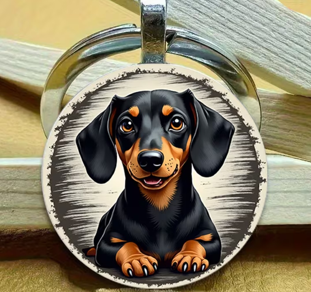 Stylový přívěsek na klíče se psem - jezevčíkem. Na přívěsku je roztomilý jezevčík. Klíčenka s populárním plemenem jezevčík je vhodná pro všechny milovníky psů.