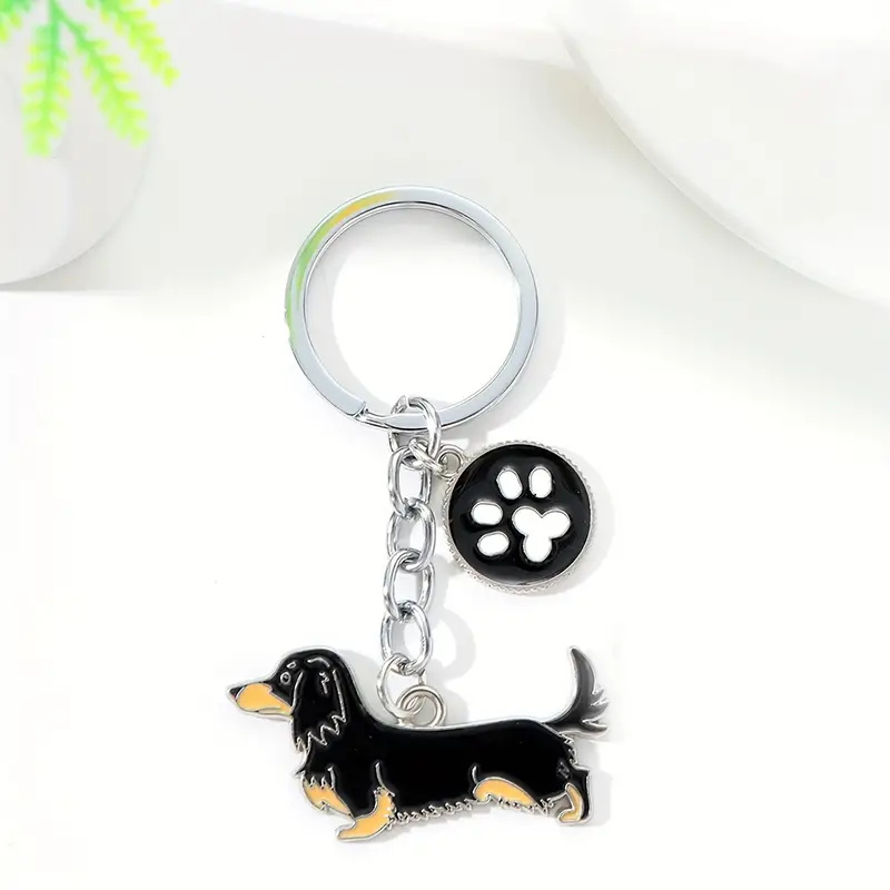 Stylový přívěsek na klíče se psem - jezevčíkem. Na přívěsku je krásný chlupatý černý jezevčík s hnědým pálením. Klíčenka s populárním plemenem jezevčík je vhodná pro všechny milovníky psů. Na klíčence je i přívěsek tlapičky, která je z jedné strany černá a z druhé bílá.