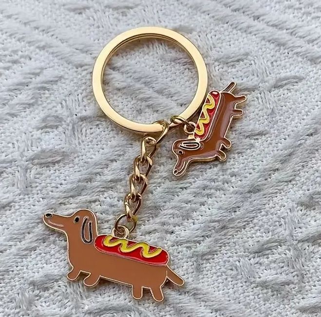 Vtipný přívěsek na klíče se psem jezevčíkem, na kterém je párek s hořčicí, jezevčík tedy působí ve stylu hot dogu. Na klíčence jsou hned dva přívěsky hnědého jezevčíka.