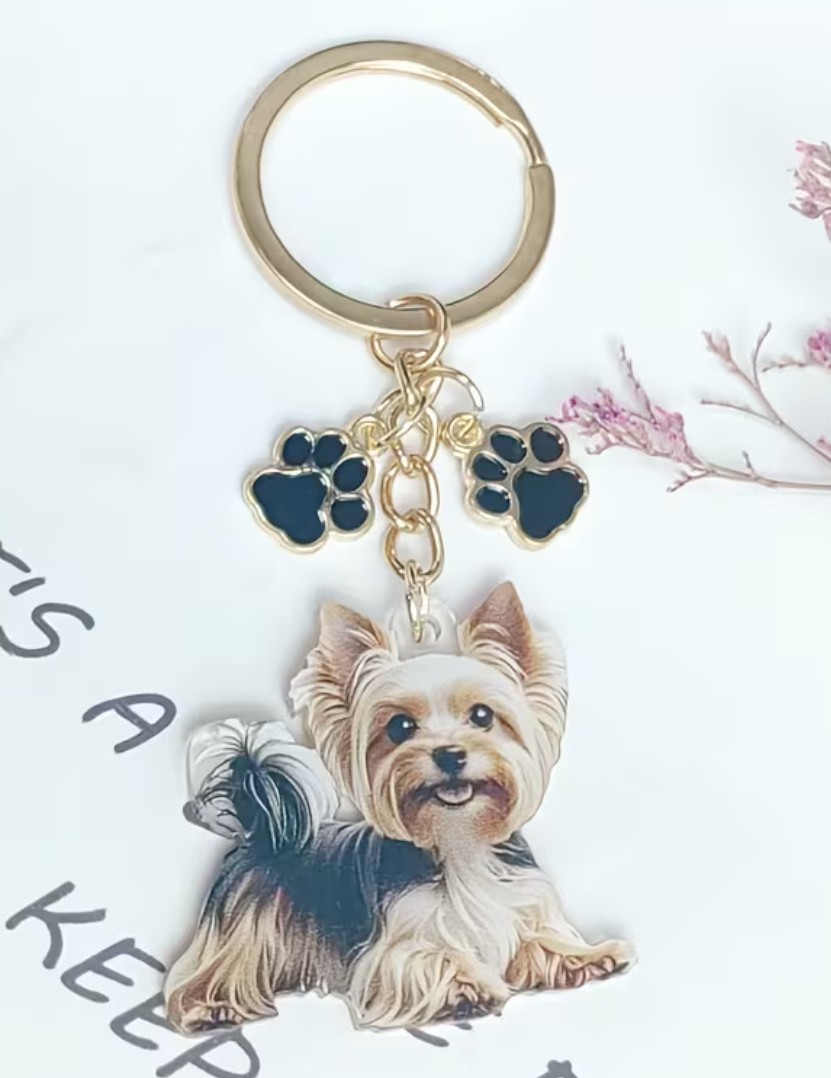 Stylový přívěsek na klíče se psem - jorkšírem. Na přívěsku je krásný roztomilý jorkšírem. Klíčenka s populárním plemenem jorkšír je vhodná pro všechny milovníky psů.