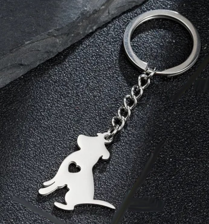 Ocelový přívěsek na klíče se psem, který má na sobě srdíčko. Klíčenka pes je vhodná pro všechny milovníky psů.