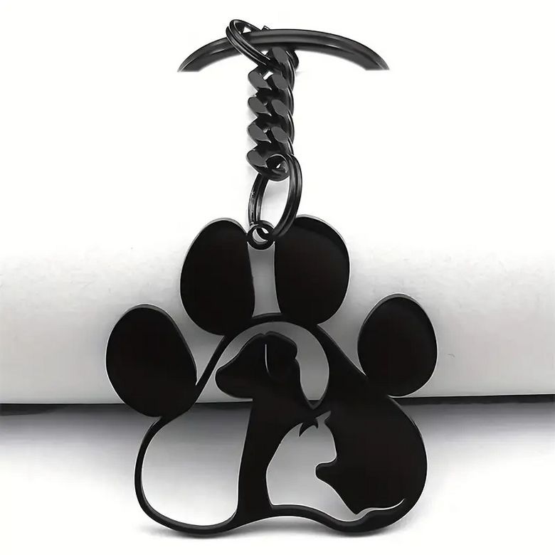 Ocelová klíčenka zvířecí tlapka, ve které vidíme psa a kočku. S přívěskem ve tvaru tlapičky snad klíče neztratíte. Tlapku na to!