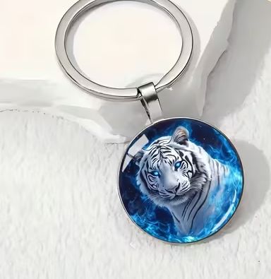 Klíčenka - přívěšek na klíče - tygr. Na klíčence je bílý tygr s modrýma očima.
