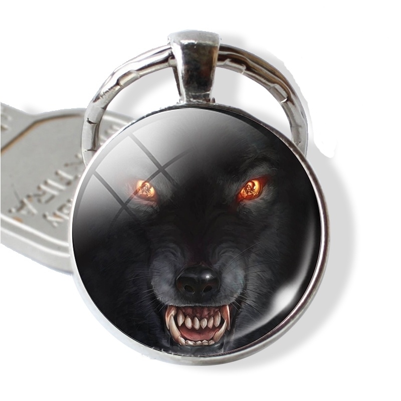 Klíčenka - přívěšek na klíče - vlk. Na klíčence je černý vlk, co má vyceněné zuby a hrozivě vypadající oči.