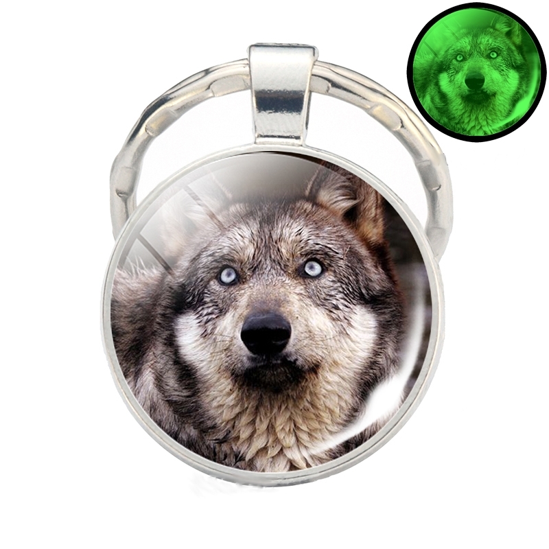 Přívěsek na klíče s vlkem. Po nasvícení obrázek svítí ve tmě.