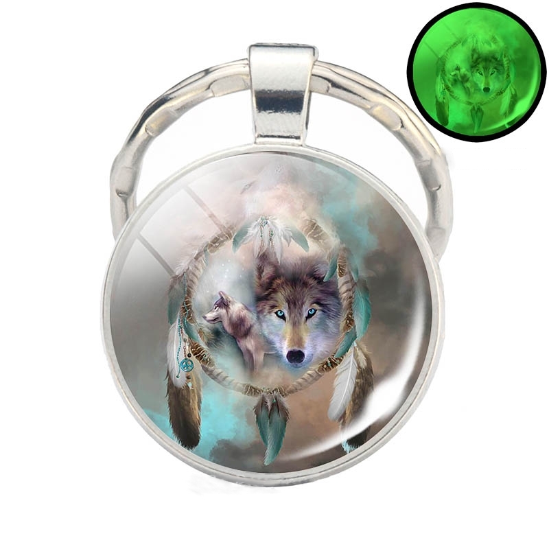 Přívěsek na klíče s vlky. Po nasvícení obrázek svítí ve tmě.