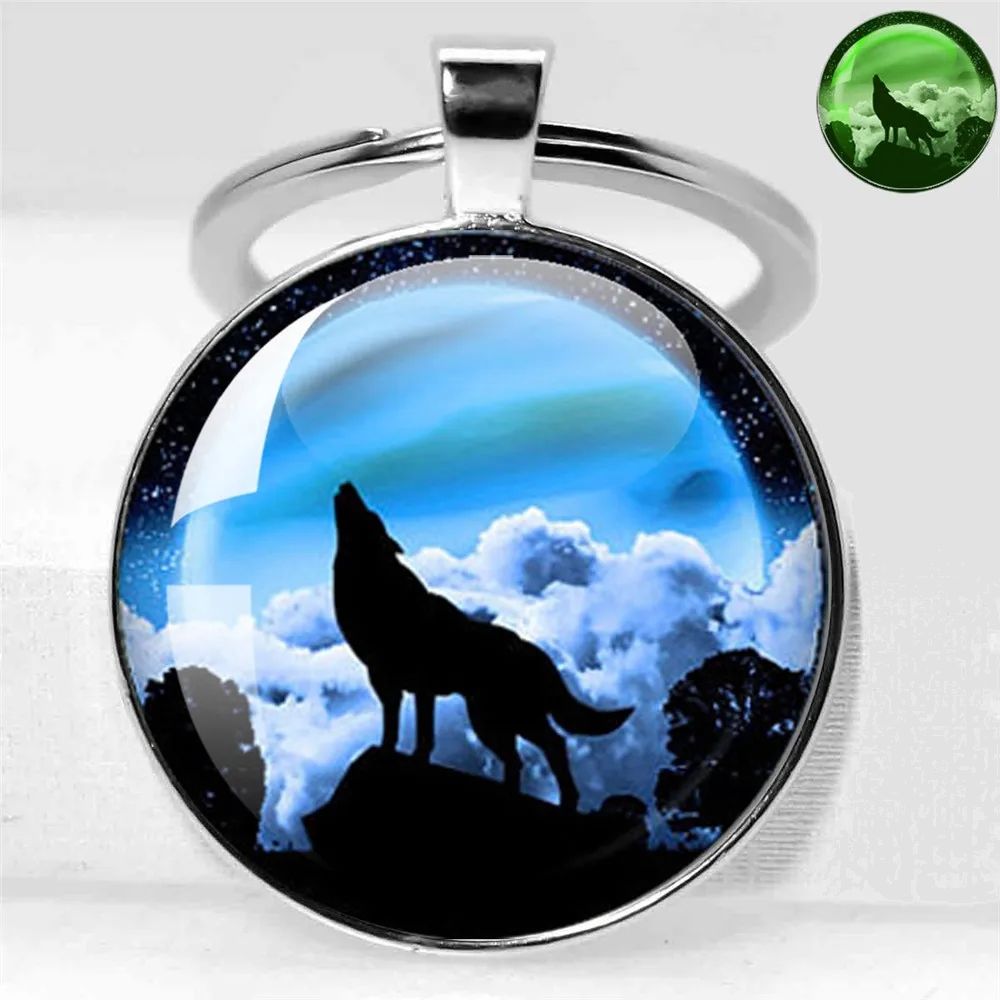 Klíčenka s vlkem. Klíčenka, na které je vlk, po nasvícení (např. lampičkou) svítí ve tmě.