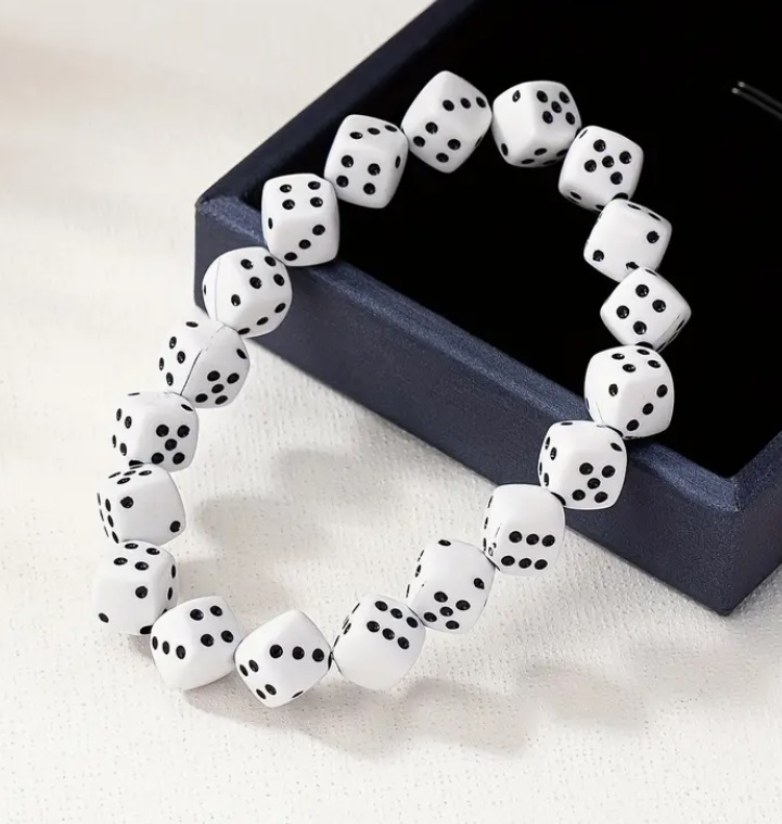 Náramek s bílými herními kostičkami. Náramek hrací kostky je skvělý doplněk na ruku pro člověka, co miluje deskovky. Náramek má průměr cca 5,5-6 cm, ale je na gumičce, takže ho lze roztáhnout.