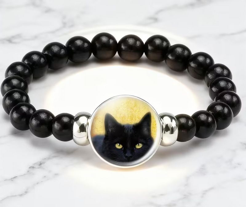 Kočičí náramek s hlavou kočky s žlutýma očima. Náramek kočka je skvělý doplněk na ruku milovníka koček.