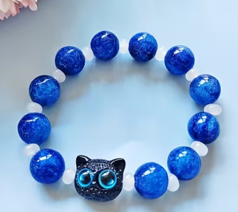 Kuličkový náramek s černou kočkou. Náramek kočka je skvělý doplněk na ruku milovníka koček.