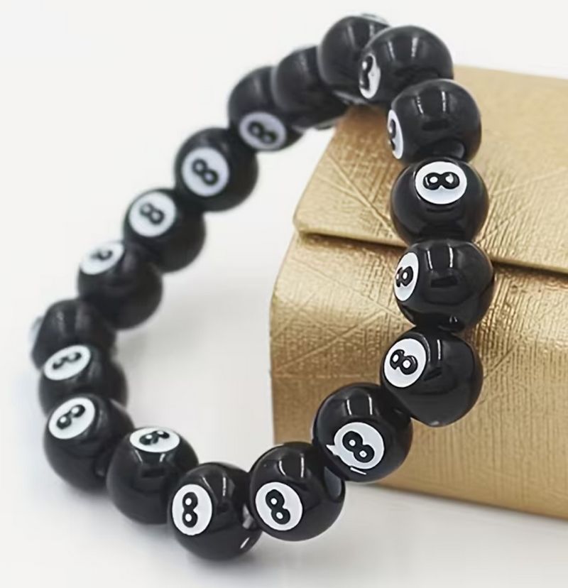 Bižuterní náramek s černou kulečníkovou koulí. Náramek kulečníková koule je na gumičce, má průměr 6 cm, ale díky gumičce lze roztáhnout. Náramek je tvořen převážně z bílých a černých kuliček.