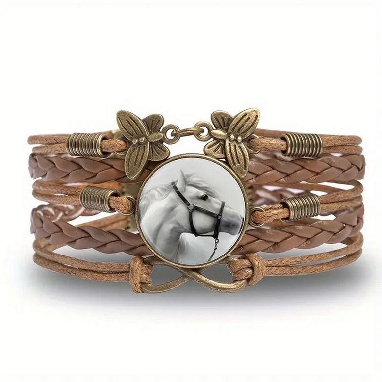 Originální hnědý náramek s bílým koněm. Náramek kůň má na sobě také znak nekonečna (infinity) a dva bronzové motýlky.
