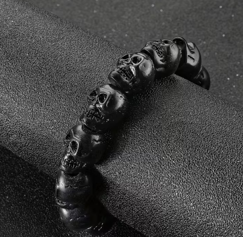 Stylový černý náramek s lebkami na gumičce. Průměr má v klidu cca 6 cm, ale díky gumičce je nastavitelný a roztáhne se.