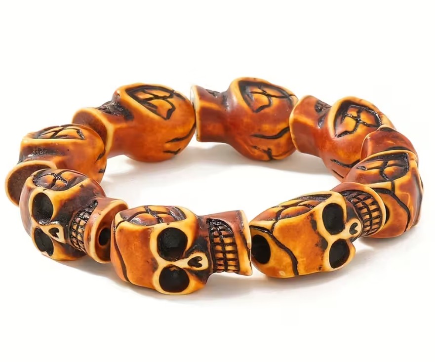 Stylový hnědý náramek s lebkami na gumičce. Průměr má v klidu cca 6 cm, ale díky gumičce je nastavitelný a roztáhne se.