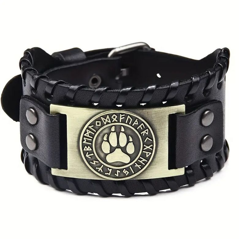 Originální černýnáramekse medvědí tlapou. Náramek medvědí tlapa je koženkový, jeho zapínání je páskové, tudíž má několik dírek, díky nimž si člověk může nastavit délku tak, aby mu padl na ruku.