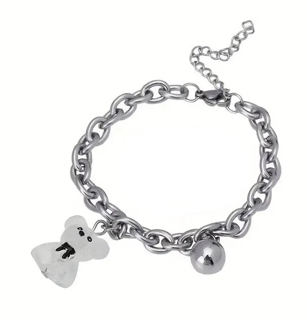 Roztomilý bižuterní náramek s průhledným medvídkem, který má černé očička a mašličku. Náramek medvídek je roztomilý doplněk na ruku dětí i dospělých. Na náramku je mimo jiné i stříbrná kulička.