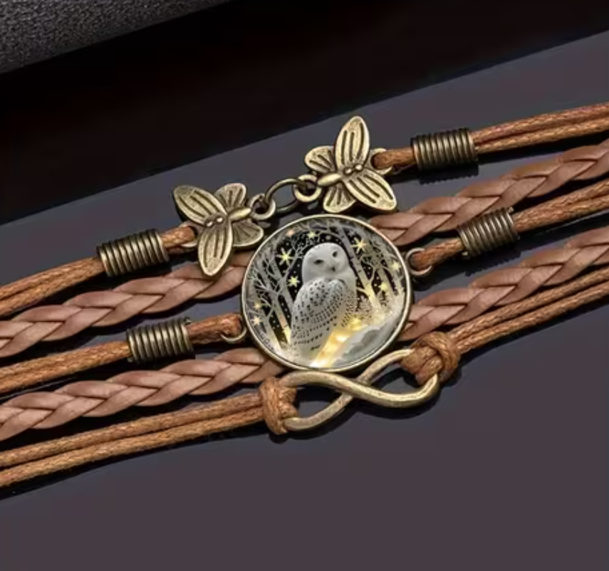 Hnědý náramek s modrou sovou, za kterou vidíme stromy a hvězdy.