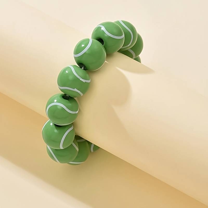 Zelený náramek tenisový míč. Náramek je na gumičce, tudíž je pružný a lze ho roztáhnout. Skvělý doplněk na ruku každého fanouška tenisu. Na náramku je hned několik tenisových míčů.