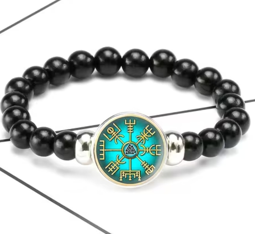 Originální černý náramek s kuličkami a se severskými motivy - vikingský kompas - vegvisir. Náramek je vhodný pro muže i pro ženy.