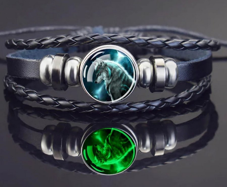 Náramek s vlkem, který kouká dolů. Náramek vlk po nasvícení svítí ve tmě.
