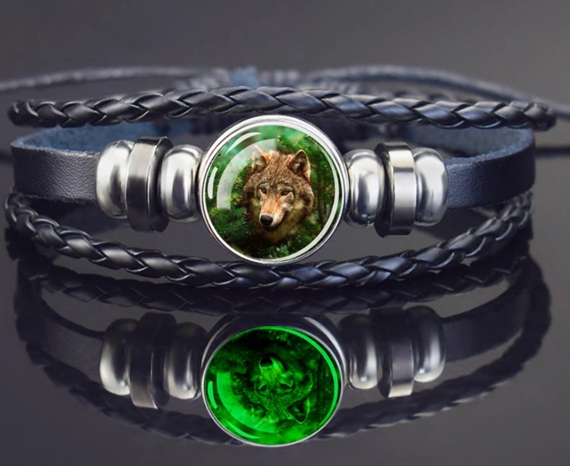 Originální náramek s hnědým vlkem, za ním je zelené pozadí. Náramek vlk po nasvícení svítí ve tmě.